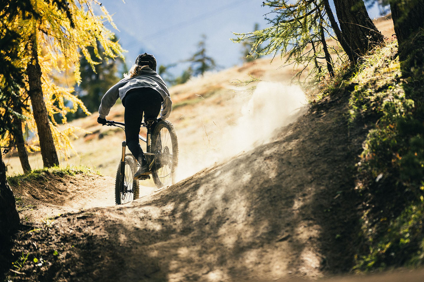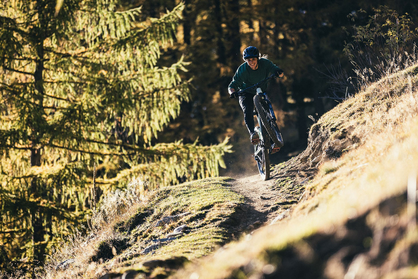 Lo que nos espera es un largo y fluido sendero hasta el fondo del valle. Con 170 mm de recorrido en los descensos y un motor para las subidas, es fácil marcarse una ronda tras otra.