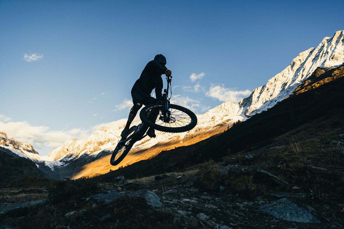 Es nuestra última bajada y estamos en la cima de la pista recién creada, soñando con dejar las primeras marcas de neumáticos en la tierra lisa. En el Valais a veces los sueños se hacen realidad. Los artífices de la creación de la pista se dan cuenta de que estamos desesperados por entrar y nos preguntan si queremos probarla. No tienen que preguntar dos veces. Recorremos la pista fresca con ellos hasta que el sol desaparece tras las montañas, regalándonos una hermosa puesta de sol antes de que la oscuridad impida seguir jugando. Esa noche nos vamos a dormir soñando con saltos.
