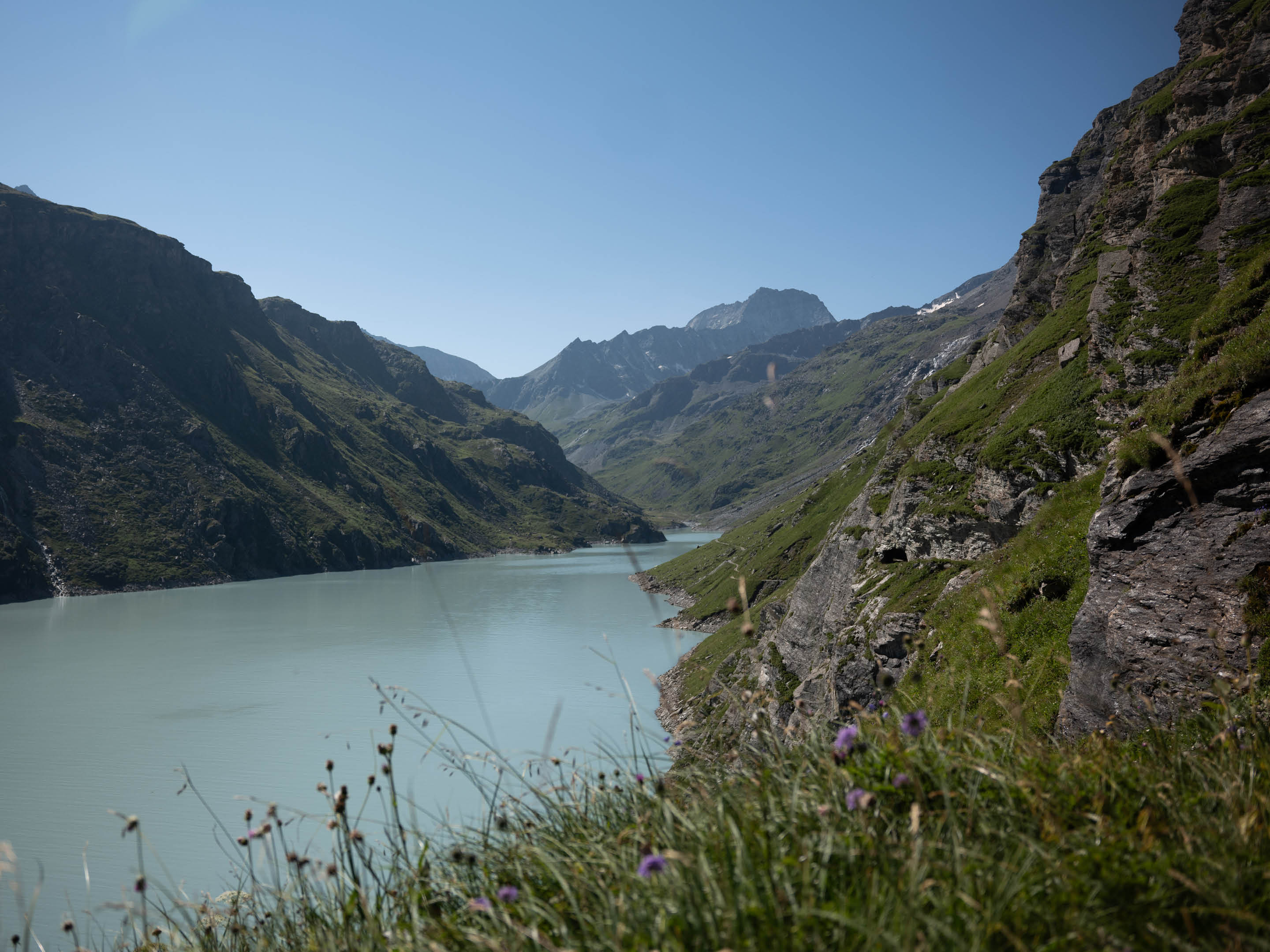 Munis juste de nos sacs à dos et de nos chargeurs de batterie, Jérôme Caroli, Dominique Müller et moi sautons dans un bus au départ du Châble, direction Mauvoisin où débute notre périple transfrontalier de deux jours. Nous longeons d’abord le lac turquoise et scintillant, avant d’entamer la montée rocailleuse.