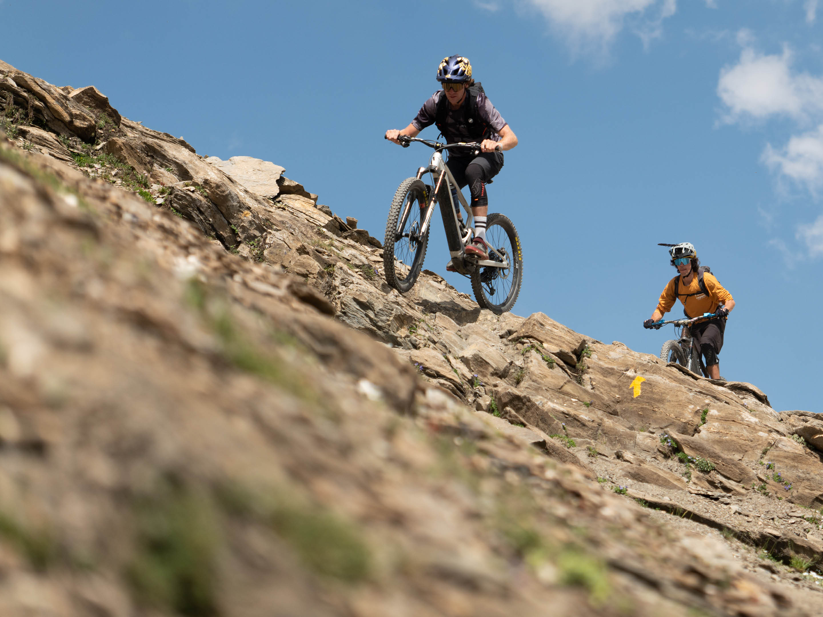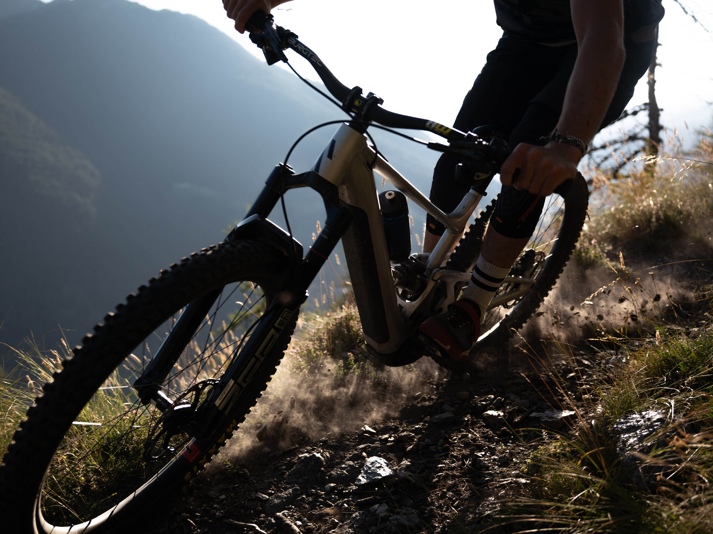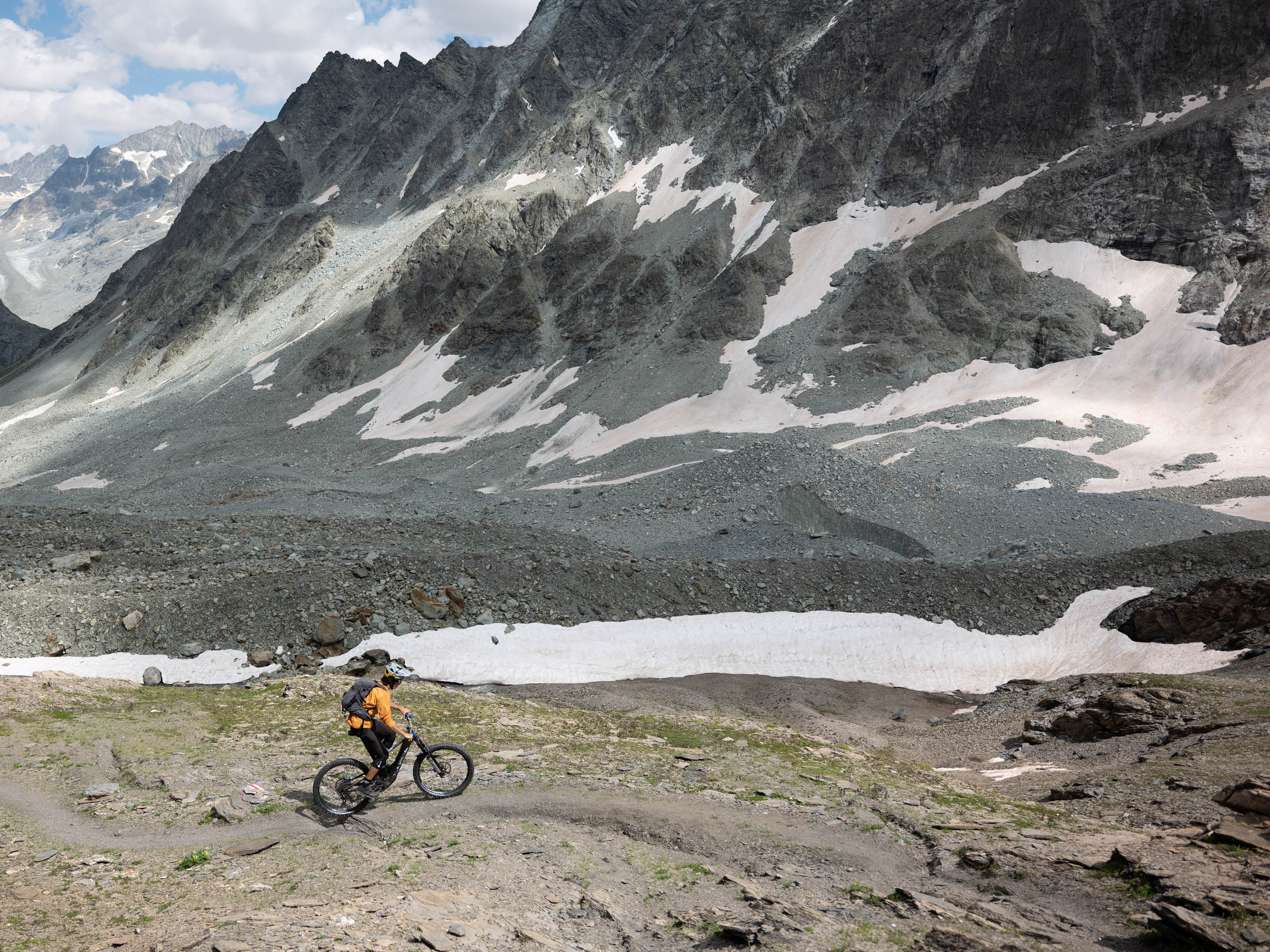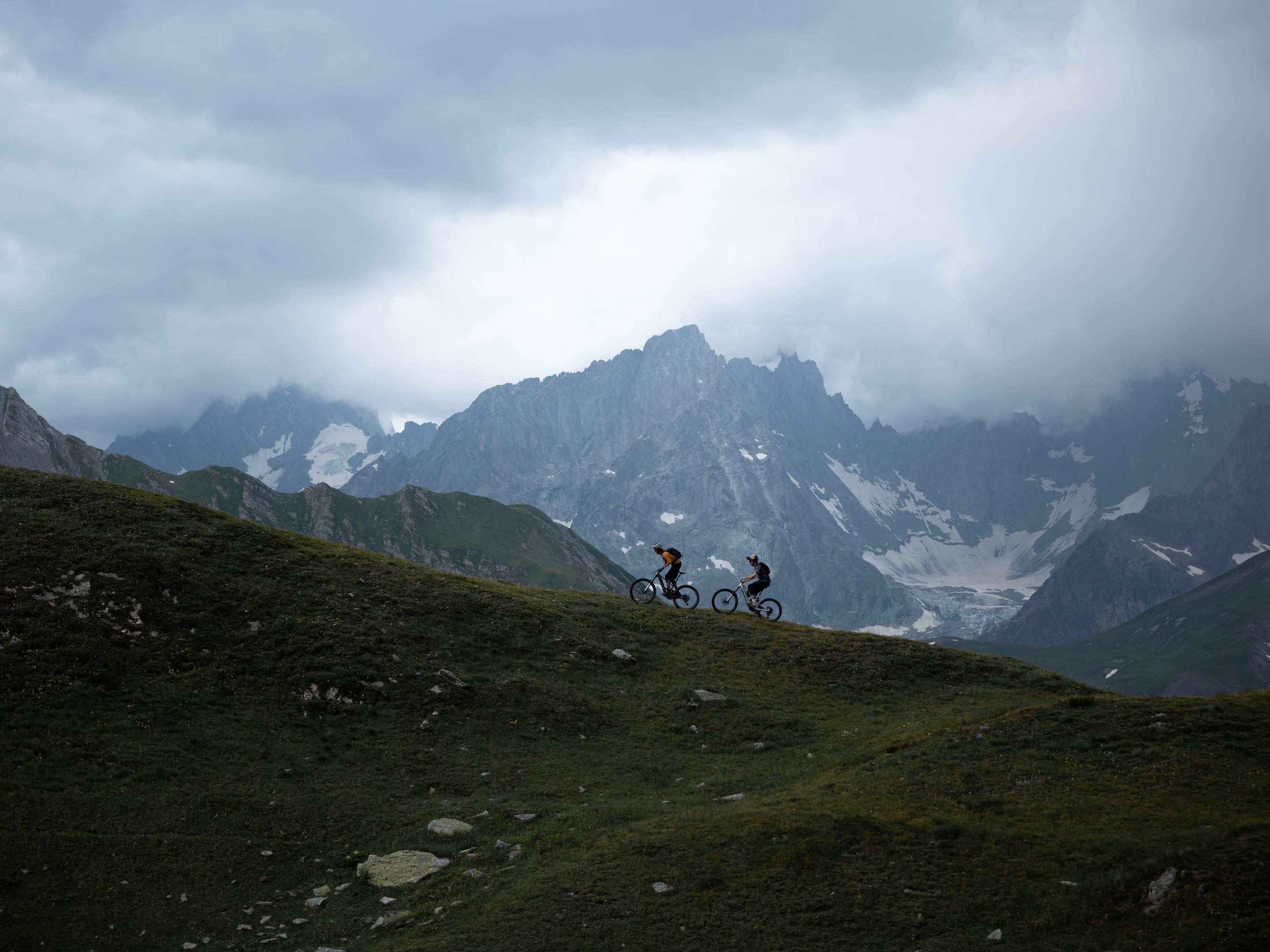 Le lendemain, nous nous dirigeons vers le col du Grand Saint-Bernard, pour retourner en Suisse, bouclant ainsi notre boucle. Nos VTTAE nous propulsent jusqu'à un sentier alpin avec une vue panoramique sur les lacs de Fenêtre et le Mont Blanc. Mais avec l’orage qui menace, nous décidons de descendre au plus vite. L’électricité, nous la préférons dans nos moteurs plutôt que dans l’air...